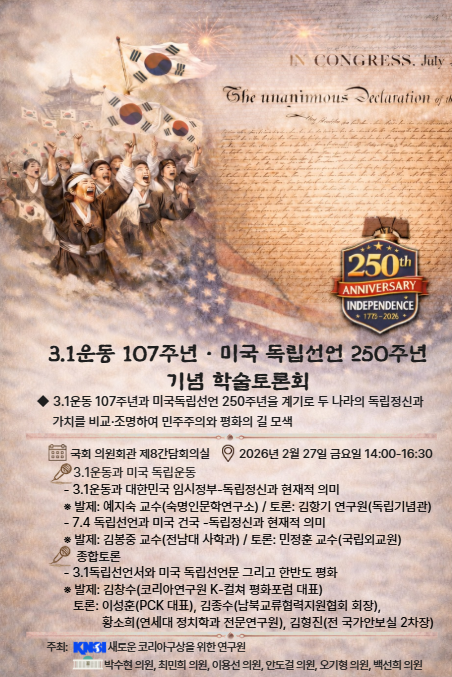 새로운 코리아구상을 위한 연구원의 회원분들과 지인분들 모두 안녕하세요. 2월 27일 오후 2시 국회 의원회관 제8간담회의실에서 새로운 코리아구상을 위한 연구원 주관으로 ‘3.1운동 107주년 - 미국독립선언 250주년 기념 학술토론회’ 행사가 진행됩니다.