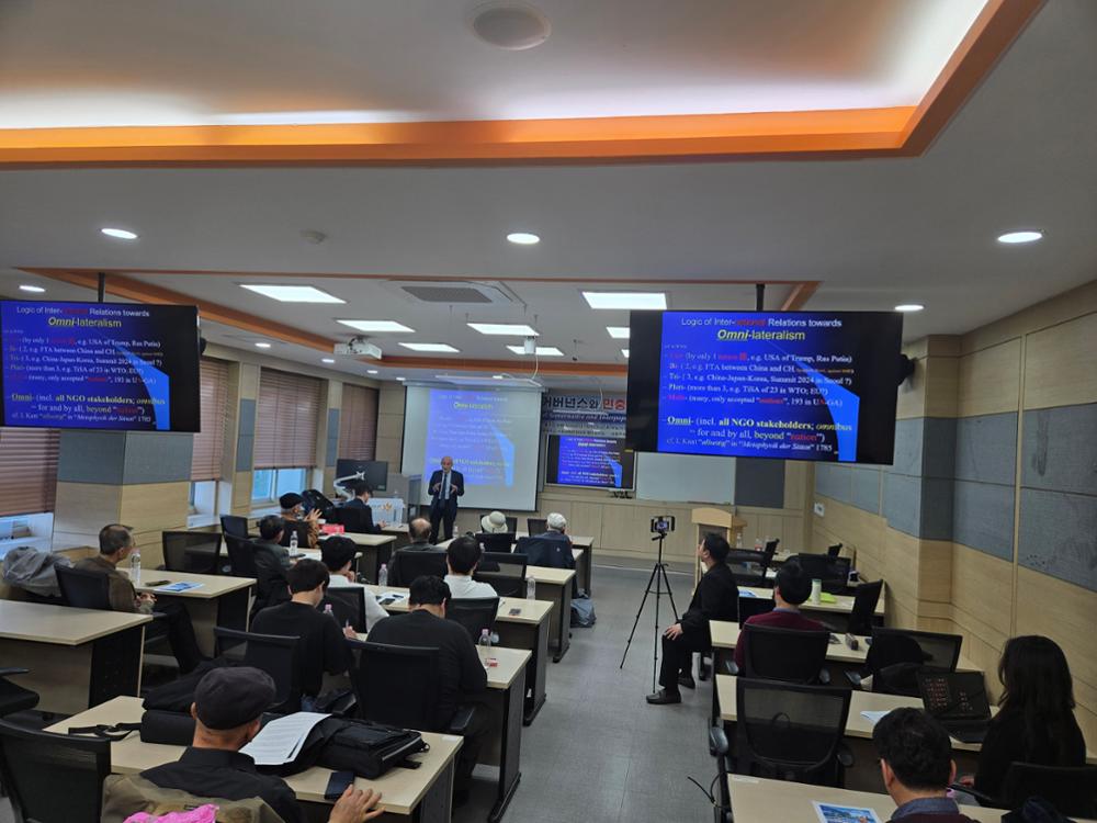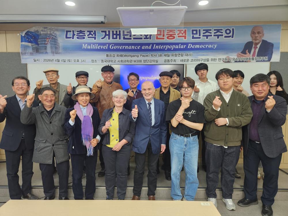 2026년 4월 4일 새로운 코리아구상을 위한 연구원과 유리시아평화통합연구원과 함께 하는 제1차 월례 평화공부방이 진행되었습니다. 볼프강 파페(Wolfgang Pape) 박사께서 '다층적 거버넌스와 민중적 민주주의'를 주제로 발표해주셨습니다. 공부방에는 총 20명의 회원들이 참가했습니다. 공부방이 진행된 후에는 참가자들끼리 식사 시간이 있었습니다.