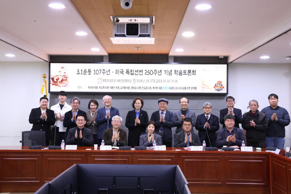 2026년 2월 27일 국회의원회관 제8간담회의실에서 '3.1운동 107주년·미국 독립선언 250주년 기념 학술토론회'가 진행되었습니다. 새로운 코리아구상을 위한 연구원과 박수현 의원, 최민희 의원, 이용선 의원, 오기형 의원, 정태호 의원, 안도걸 의원, 백선희 의원이 공동으로 주최하였으며 행사에 사용된 자료집은 첨부파일을 참고해주세요.